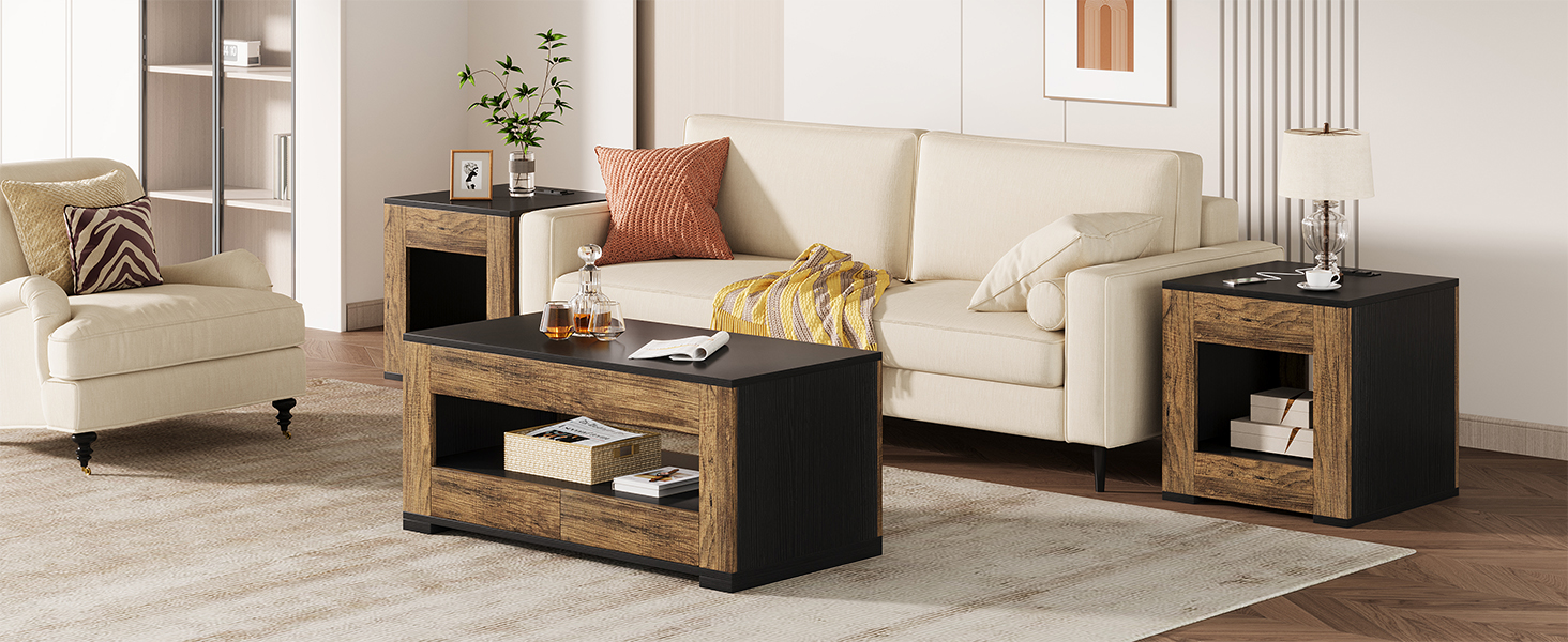 The black and brown wood-grain finish combines rustic charm with contemporary design, making this coffee table a focal point in any living room. Its classic farmhouse style with a sleek black finish complements a wide range of interior styles, from cozy to modern, adding warmth and character to your space.