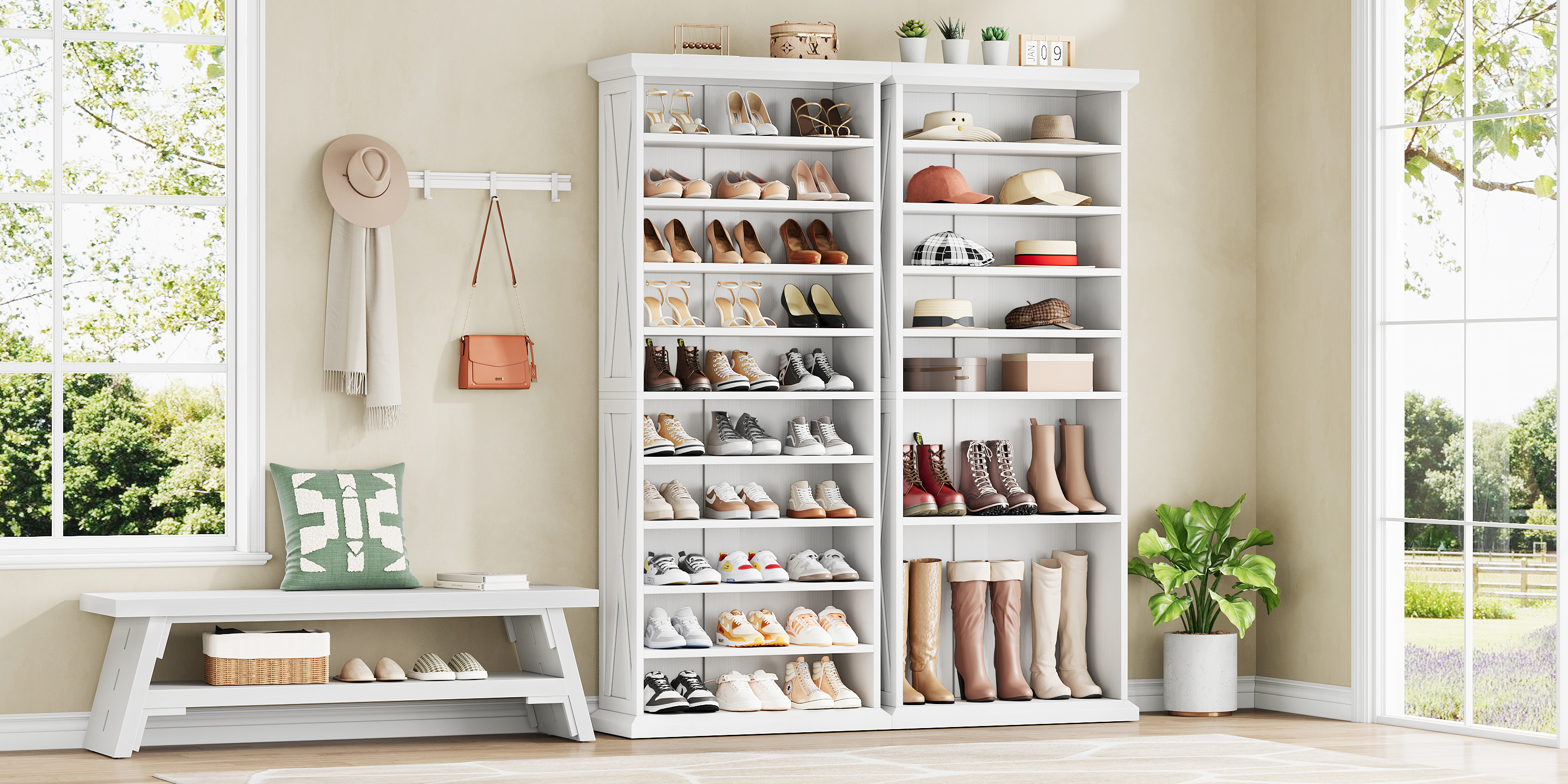 Measuring 47 inches in length, it offers ample space for comfortable seating or shoe changing. The lower storage shelf neatly organizes shoes and storage boxes, ensuring a tidy and orderly entrance area
