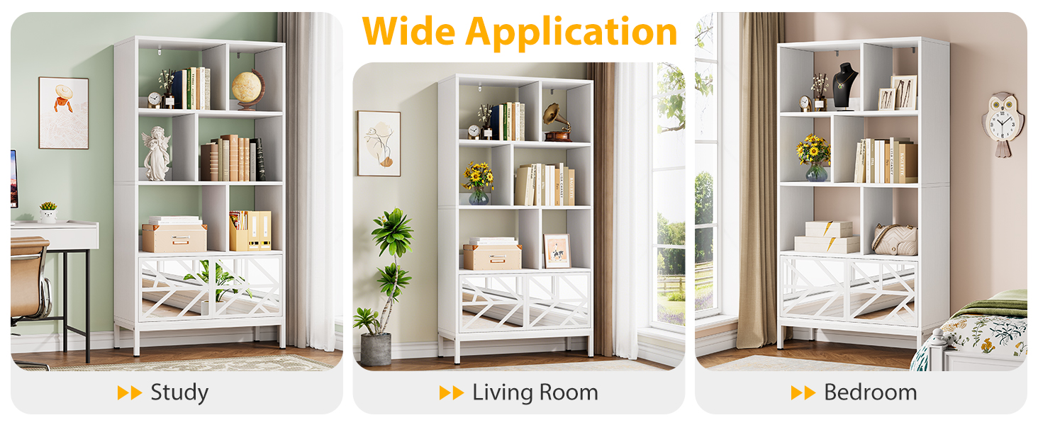 Simple & Elegant: Featuring clean lines and mirrored acrylic doors, this modern bookshelf offers a sleek look while brightening your space with a touch of elegance.