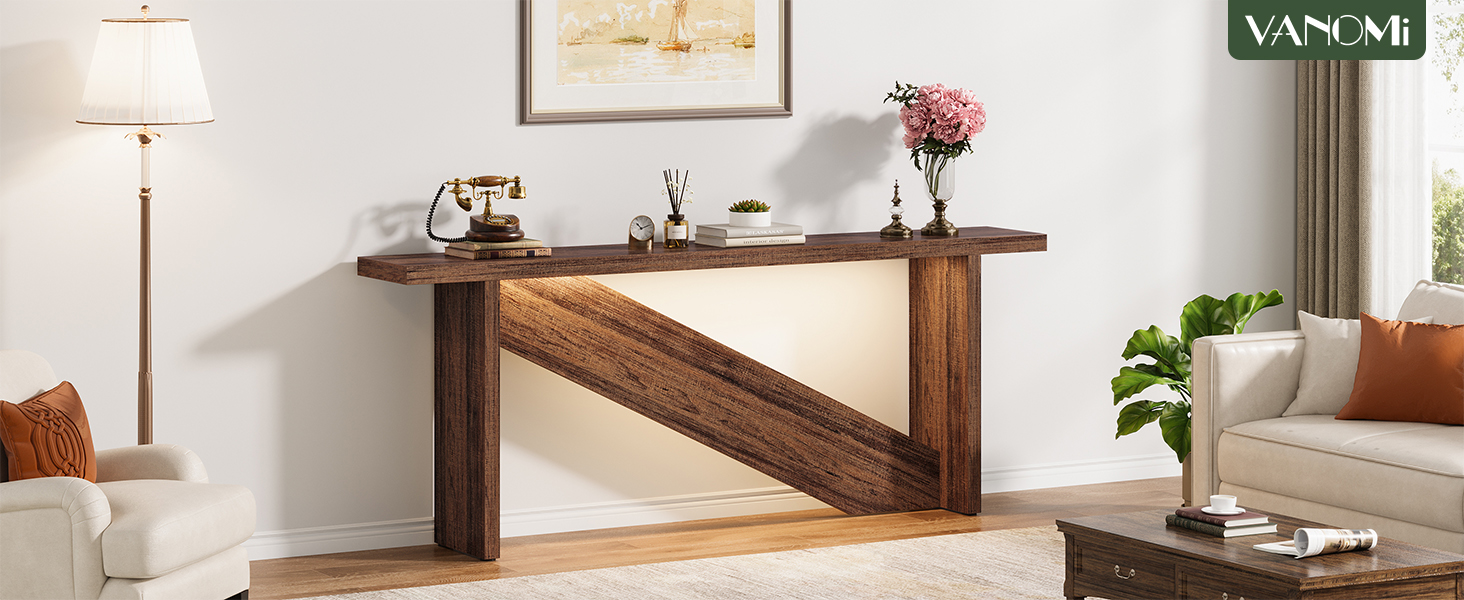 This N-shaped console table with smart LEDs combines a rustic brown wood grain finish and minimalist design, adding industrial chic and farmhouse elegance to your space. Additionally, the durable, scratch-resistant, and waterproof 1.57-inch thick MDF tabletop ensures reliable stability and easy cleaning