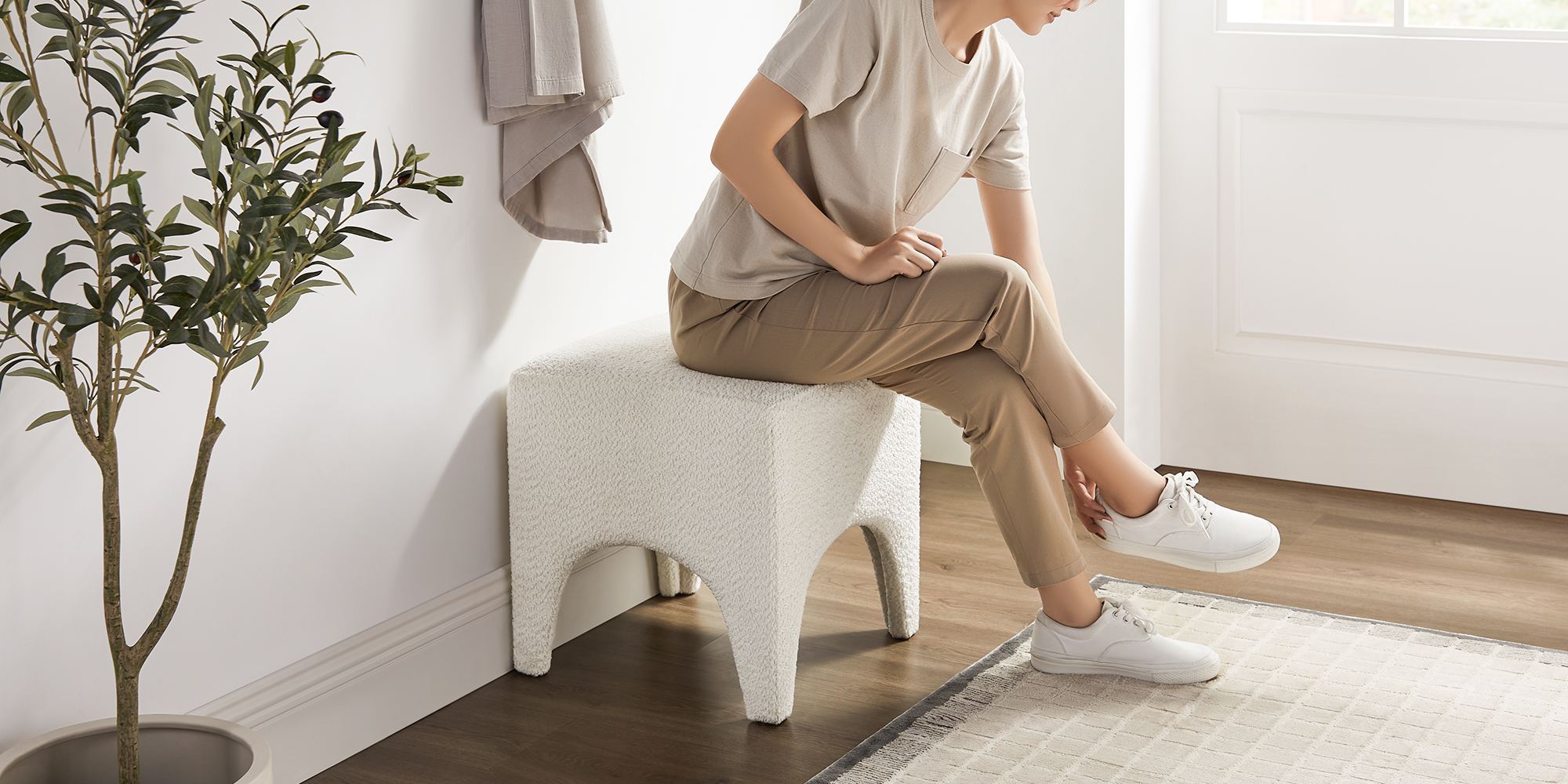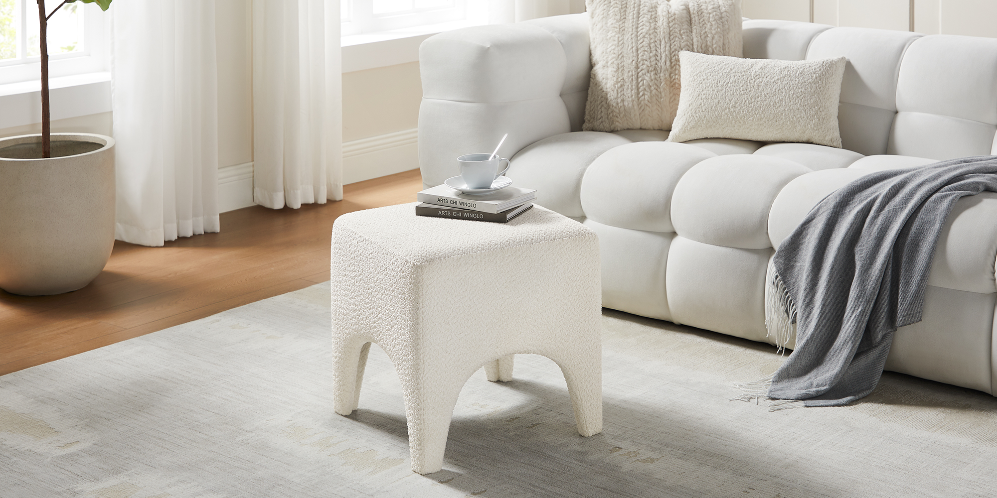 Upholstered in looped boucle fabric with soft curved edges, this stool has the warm, tactile quality that makes a room feel considered rather than assembled. It works equally well as a footrest, a vanity seat, or a standalone accent piece