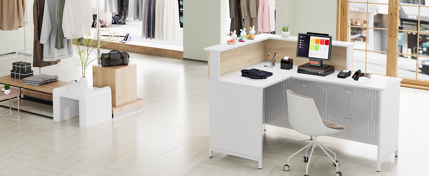 Whether used as a front desk reception counter, a hostess stand, or a reception counter for restaurants, this desk adapts seamlessly. Its clean lines and professional look make it ideal for corporate offices, beauty salons, hotels, and retail spaces