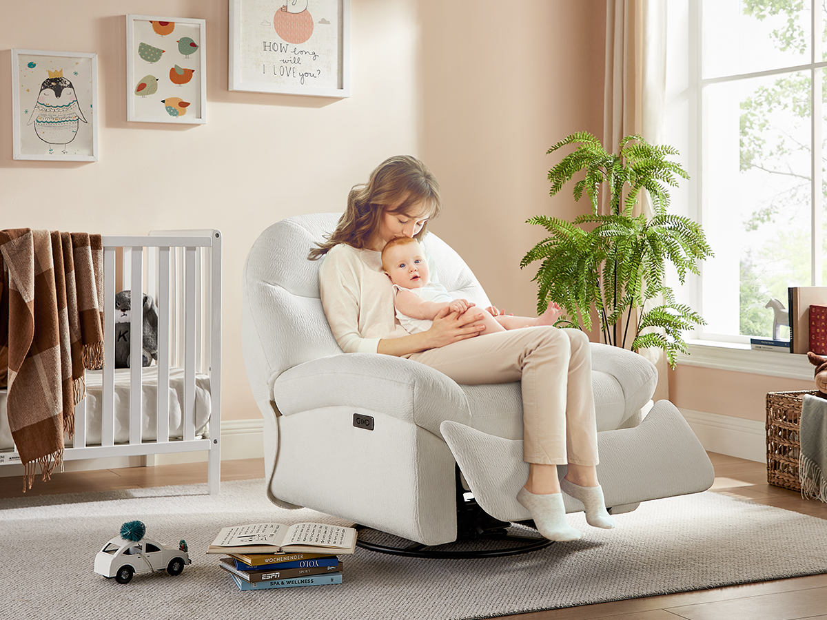 ✨This nursery recliner featuring 270° swivel and gentle gliding motion to soothe your little one, complemented by elegant roll arms and timeless design.