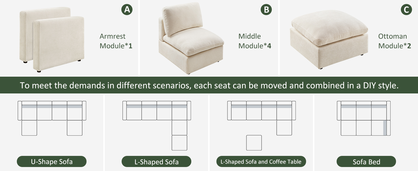 Elevate your downtime with our modular sofa's upgraded side seat and armrests.Perfectly crafted for lounging, leaning, or stretching out, these components promise exceptional comfort after a busy day.