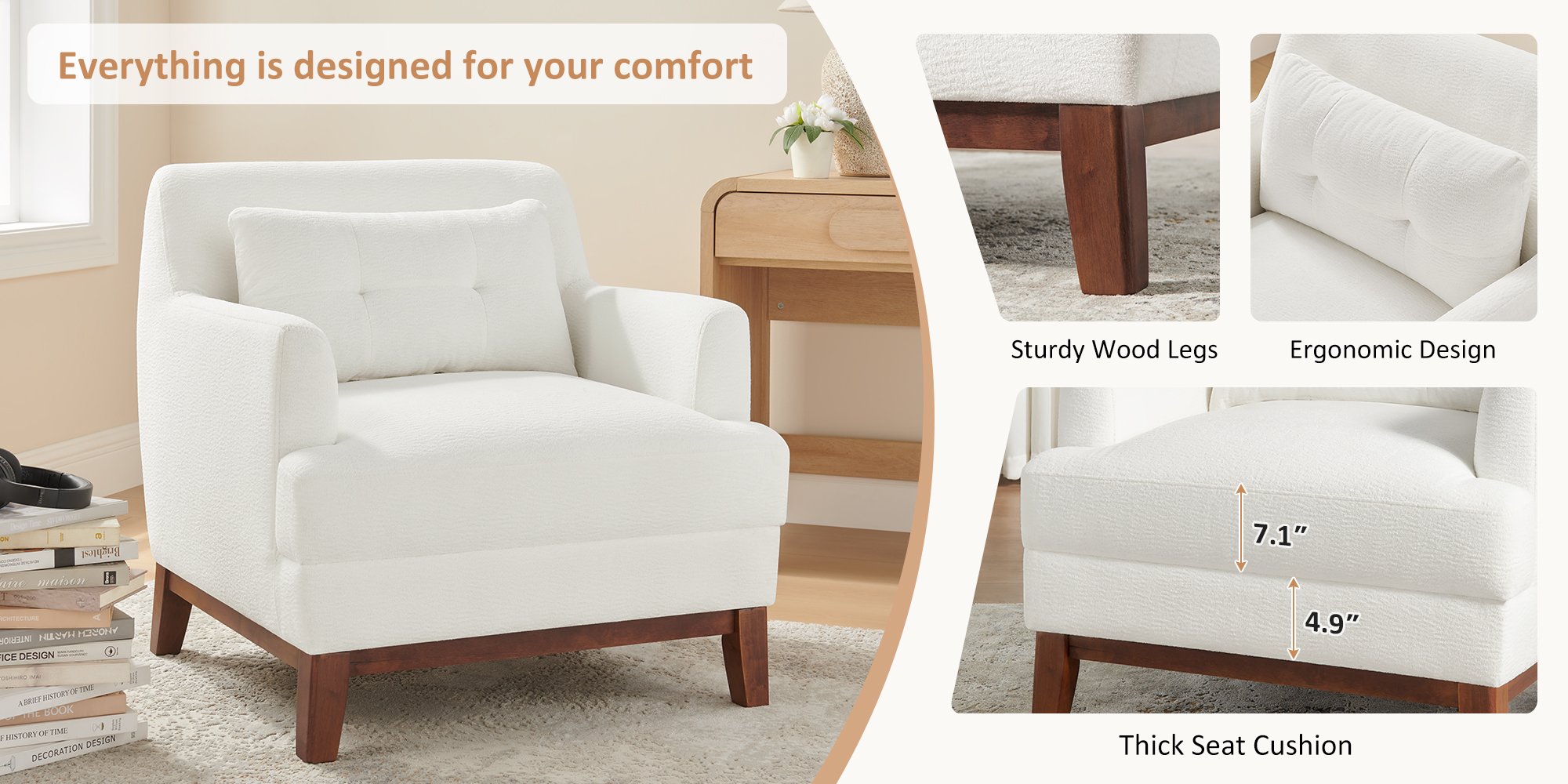 Built with a sturdy wooden base that supports up to 332 lbs, this living room chair is strong, stable, and made to last. Perfect as a reading chair, chair for bedroom, or centerpiece chair with cushion in your living room