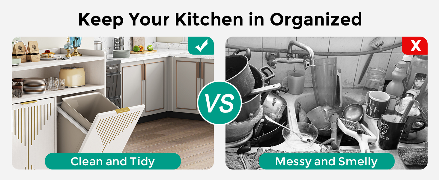 The spacious top surface and open shelf provide versatile options for placing kitchenware, juicers, coffee makers, and more. The tilt-out design conceals two 10-gallon bins, keeping your kitchen floor clean, curbing odors, and preventing pets from accessing or tipping over the trash cans. (Trash cans not included)