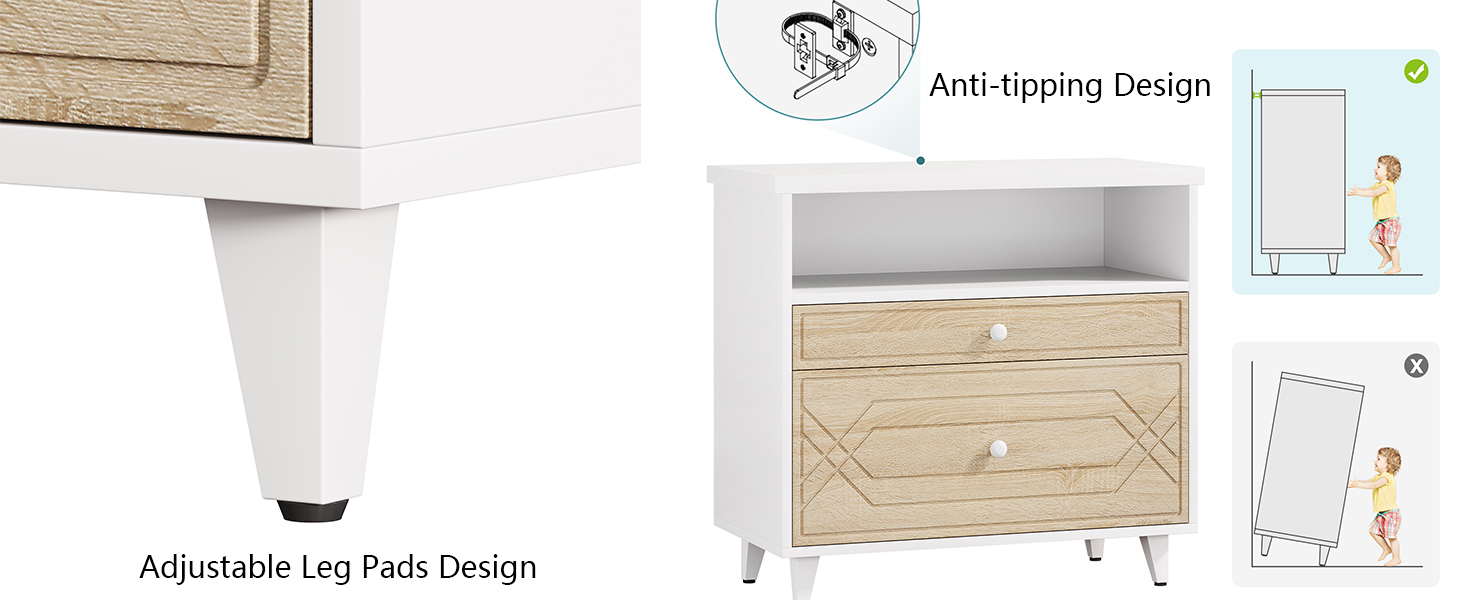Equipped with anti-tipping kits and adjustable leg pads, this cabinet prioritizes safety, making it an ideal choice for homes with children, providing peace of mind.