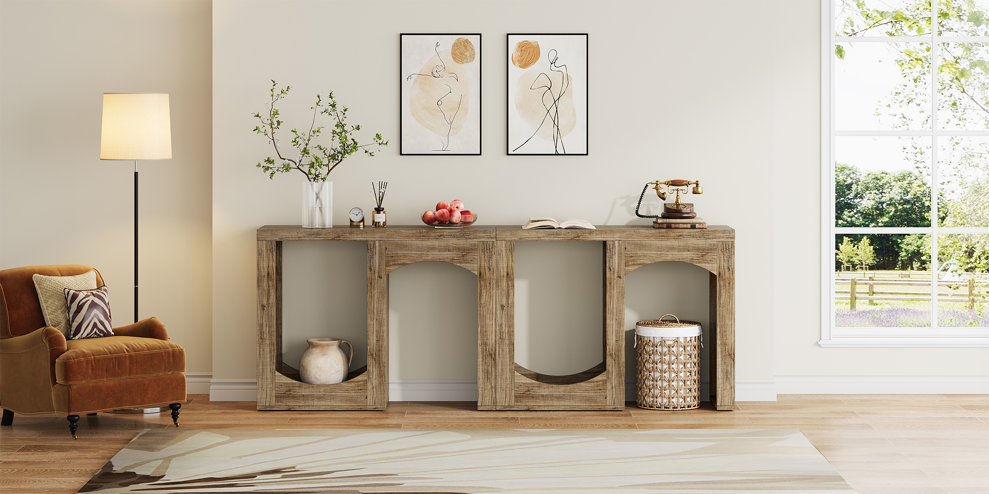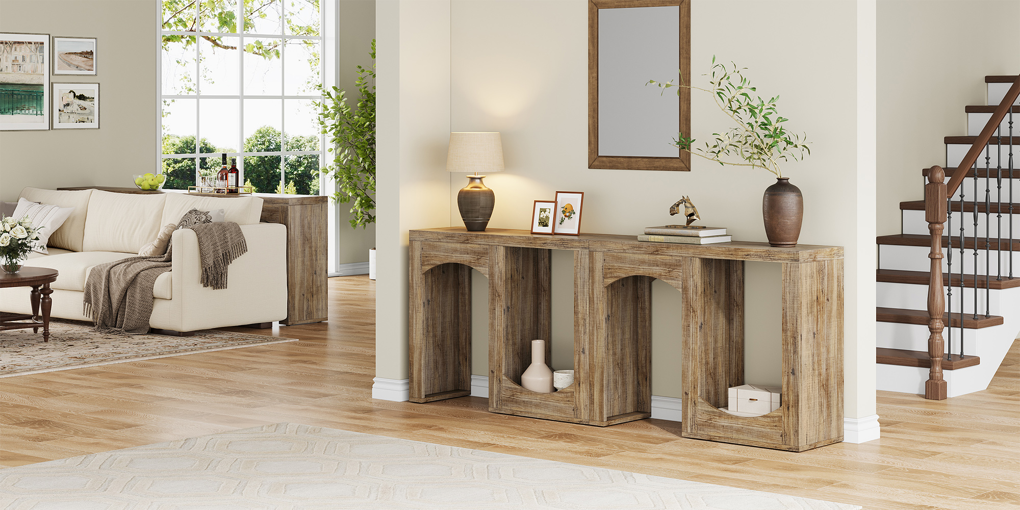 The arched design of the base paired with a warm rustic brown finish adds architectural interest and cozy charm to any room. Whether your home leans farmhouse, modern, or transitional, this high-quality console table anchors the space with timeless style.