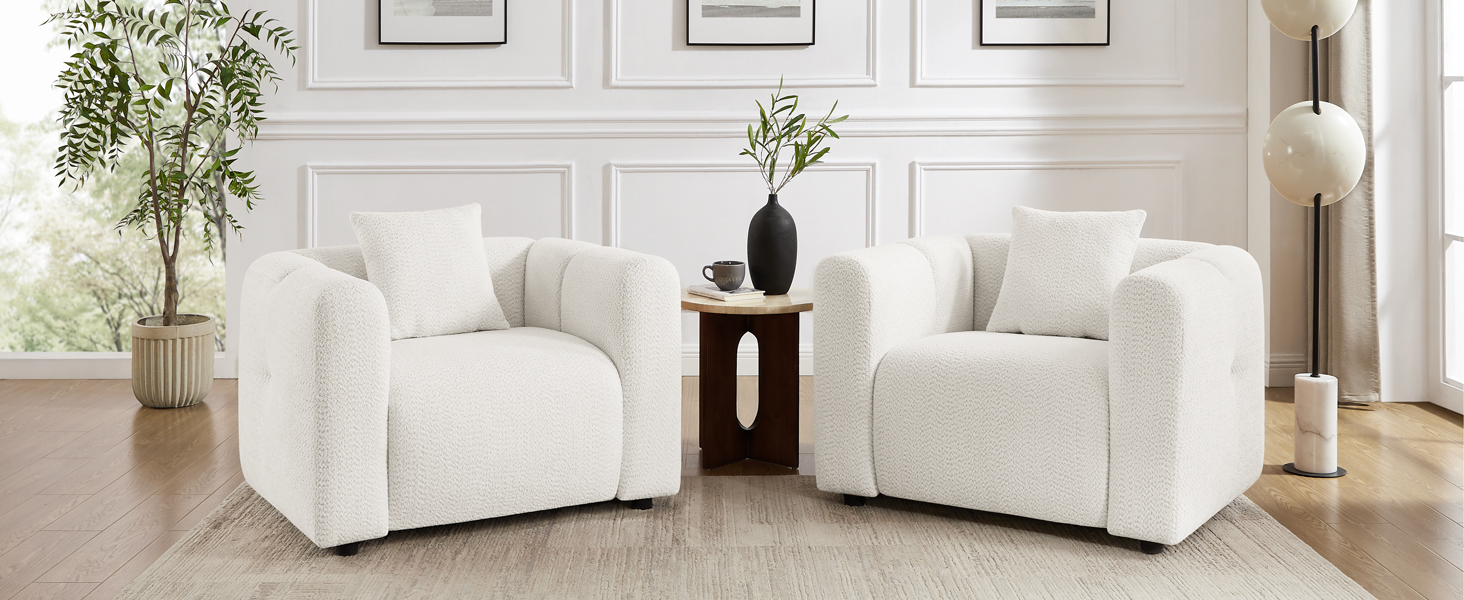 This couch and chair set features soft boucle fabric that feels luxurious against your skin—no more rough surfaces irritating your relaxation time